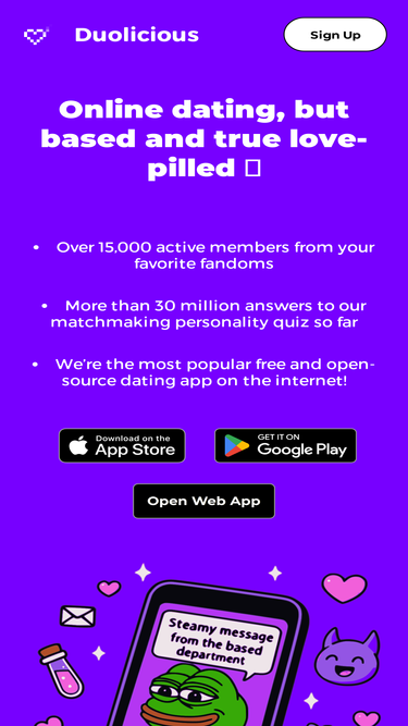 71%online dating, but based and true love-pilled ❤️. over 2000 match questions from anime to life goals. fall in love and find a relationship at duolicious.
