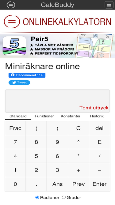 100%avancerad miniräknare online, med 15 matematiska funktioner, 30 vetenskapliga konstanter, bråkform och komplett beräkningshistorik.