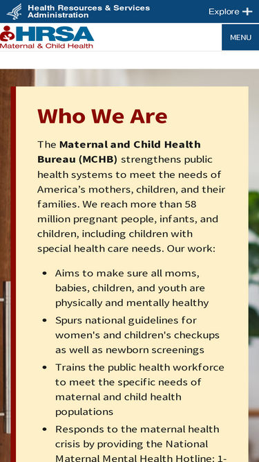 60%the maternal and child health bureau (mchb) works to improve the health and well-being of america’s mothers, children, and families.