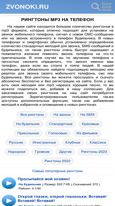 92%здесь вы всегда сможете найти, прослушать и скачать самые лучшие и самые скачиваемые mp3 рингтоны для своего мобильного телефона, которые можно установить на звонок, смс или будильник. все мелодии и реалтоны доступны для скачивания абсолютно бесплатно и без регистрации!