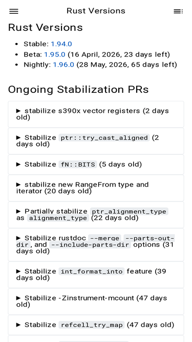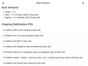 84%Rust Versions # Stable: 1.93.1 Beta: 1.94.0 (5 March, 2026, 9 days left) Nightly: 1.95.0 (16 April, 2026, 51 days left) Ongoing Stabilization PRs # Stabilize control_flow_ok (4 days old) S-waiting-on-review - Status: Awaiting review from the assignee but also interested parties. T-libs - Relevant to the library team, which will review and decide on the PR/issue. Open PR #152911 Stabilize rustdoc --merge --parts-out-dir, and --include-parts-dir options (4 days old) T-rustdoc - Relevant to the rustdoc team, which will review and decide on the PR/issue. S-waiting-on-review - Status: Awaiting review from the assignee but also interested parties. proposed-final-comment-period - Proposed to merge/close by relevant subteam, see T- label. Will enter FCP once signed off. disposition-merge - This issue / PR is in PFCP or FCP with a disposition to merge it. needs-fcp - This change is insta-stable, or significant enough to need a team FCP to proceed. A-run-make - Area: port run-make Makefiles to rmake.rs Open PR #152902