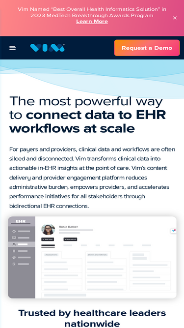 85%Vim improves network performance and enhances member experience by connecting payers to health care’s last mile: provider workflow at the point of care.