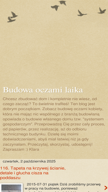 87%Chcesz zbudować dom i kompletnie nie wiesz, od czego zacząć? To świetnie trafiłeś! Ten blog jest dobrym początkiem. Zobacz budowę oczami kobiety, która nie mając nic wspólnego z branżą budowlaną opowiada o budowie własnego domu tzw. "systemem gospodarczym". Przeprowadzę Cię przez cały proces, od papierów, przez realizację, aż do odbioru technicznego budynku. Dzielę się moimi doświadczeniami, abyś miał łatwiej niż ja gdy zaczynałam. Przeczytaj, skorzystaj, udostępnij! Zapraszam :) Klara