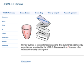 100%review for the usmle online by organ blocks. outline of one-sentence disease and drug summaries. searchable usmle disease and drug banks.