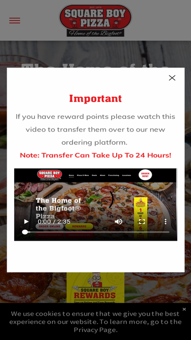 87%Welcome to Square Boy Pizza| Home of the Bigfoot® Pizza! Serving pizza since 1979 in 13 Ontario towns. Check out our menu for round, square, and Bigfoot® pizzas. Order online or pick up. Contact us for more info.