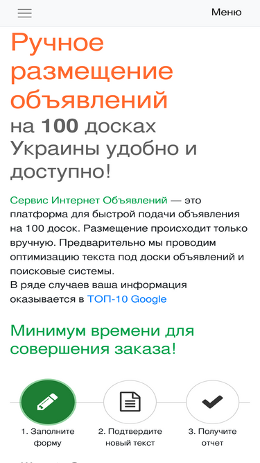 100%сервис интернет объявлений onboard.net.ua предоставляет услуги ручного размещения объявлений на лучшие украинские доски в интернете. предварительно проводим оптимизацию текста под поисковые системы. для подачи объявления достаточно заполнить форму, выбрать схему размещения и способ оплаты. частное объявление будет подано в течение трех дней после оплаты публикации.