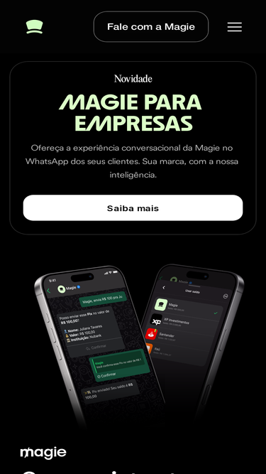 86%Conecte seus bancos na Magie e faça todos os seus pagamentos no WhatsApp através do ambiente seguro do Open Finance. Faça um Pix por foto e áudio, consulte e pague boletos em seu nome e muito mais.