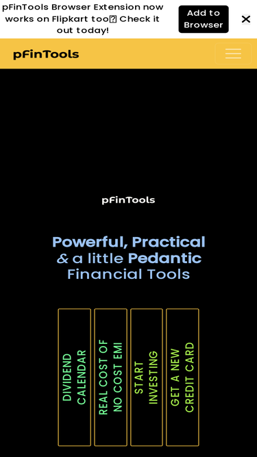 96%pFinTools is India's First Practical Finance Tools Platform with products like India's First Real Cost of Credit Card No Cost EMI and India's First and only Practical Dividends Calendar that shows the dividend yield of any upcoming dividend in 2026 as a function of realtime stock price. Through the pFinTools Shopping Assistant Browser Extension, users can find real cost of Credit Card EMIs including No Cost EMIs right from the prducts page on Amazon/Flipkart. This extension has been voluntarily featured by top instagram influencers, tech youtubers, lifestyle content creators and finfluencers like Dhananjay Tech, Anushka Rathod, Harsh Punjabi (Technolobe), Aravind Suriya (Tamil Finance), Abhishek Bhatnagar (GadgetToUse), Arjun Koroth, Welath with Prateek and many more. pFinTools can also Cherry Pick Credit Cards that work for you or guide you in your journey as you start investing in Stocks and Mutual Funds. The pFinTools Reddit community is the go to place to discuss all things Personal Finance and seek any guidance.