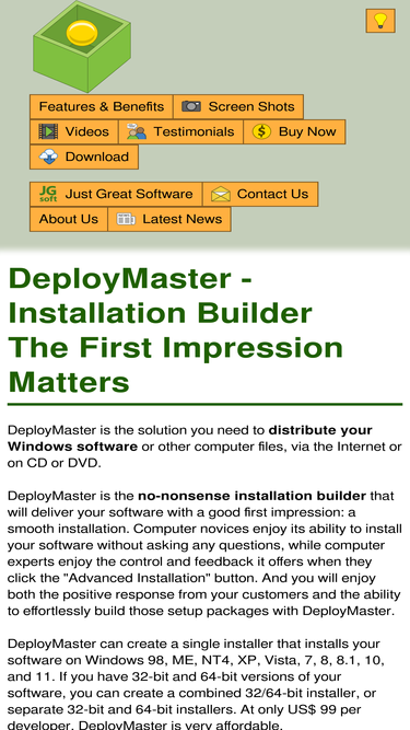 76%deploymaster is the no-nonsense software installer builder from just great software. deliver your applications to customers and prospects with a good first impression. easy to use for both the developer and the end user.