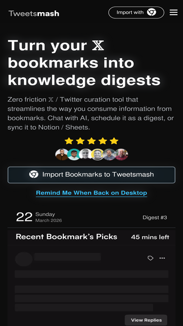 Tweetsmash creates a reading digest from your Twitter bookmarks and streamlines the process of curating, reading, organizing, and exporting them.