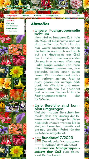 82%herzlich willkommen bei der deutschen dahlien-, fuchsien- gladiolen- gesellschaft e.v. hier finden sie informationen rund um die pflanzenliebhaber - gesellschaft, sowie die themenbereiche dahlien, fuchsien, gladiolen, brugmansien, pelargonien und kübelpflanzen. im mitgliederbereich können sie die jahrbücher und rundbriefe lesen, vom aktuellen rundbrief über die jahrbücher bis zu den sonderdrucken.