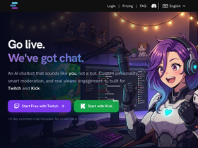 90%The most advanced AI chat bot for Twitch and Kick streamers. Boost engagement with AI responses, custom personalities, chat games, rewards, and TTS. Start your free 14-day Ruby trial today.