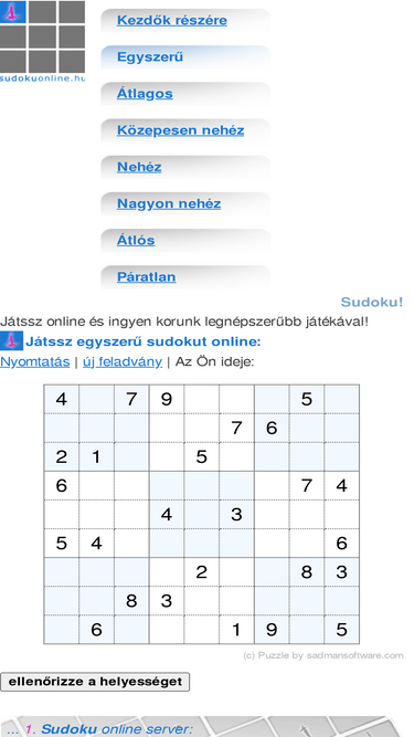 74%játsszon sudokut online módon! ingyenes választási lehetőség: sudoku kezdők részére, egyszerű sudoku, közepesen nehéz, nehéz, nagyon nehéz, átlós …