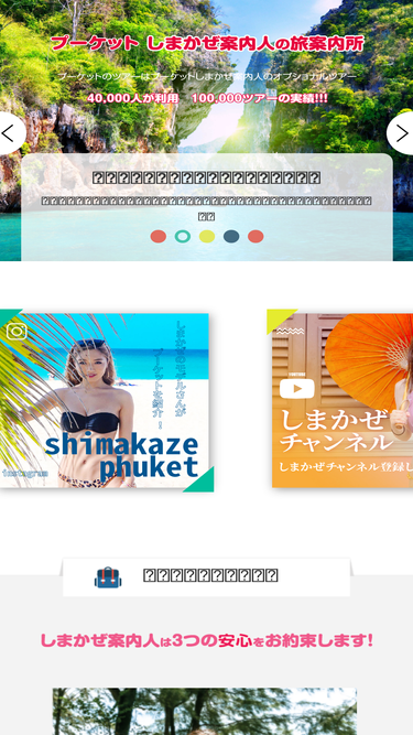 プーケット発のオプショナルツアーの予約代理店。安心の日本人夫妻経営。現地で日本語、ツアーサポートもお任せ。プーケットの各種ツアー、スパ、ダイビングツアーを取り扱い中。