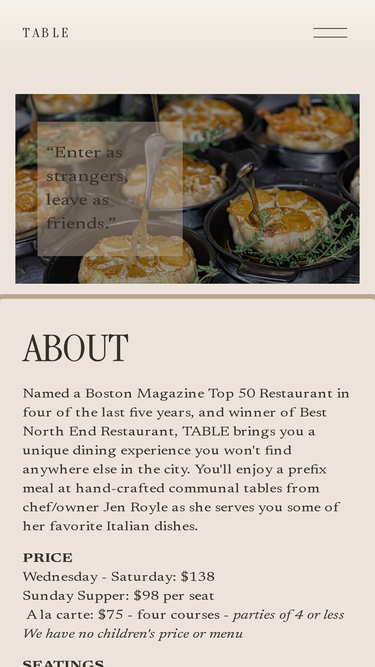 100%Experience a unique and cozy family-style dinner at TABLE on Hanover Street in Boston's North End. Contact us today for reservations.