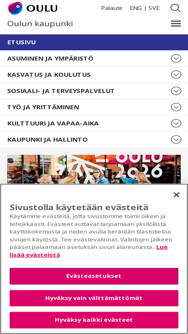 Oulun kaupungin verkkosivut tarjoavat tietoa kaupungin palveluista ja ajankohtaisista asioista. Oulu on Euroopan kulttuuripääkaupunki 2026. Tervetuloa.