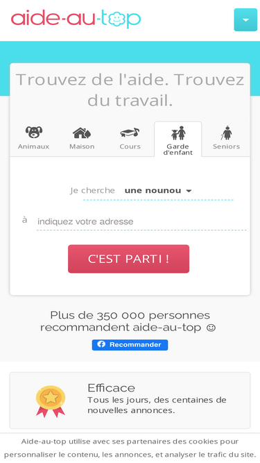 92%Garde d'enfants, soutien scolaire, ménage, aide à la personne. Profils qualifiés. Contrat, aides CAF, crédit d'impôt automatisés à coûts réduits.