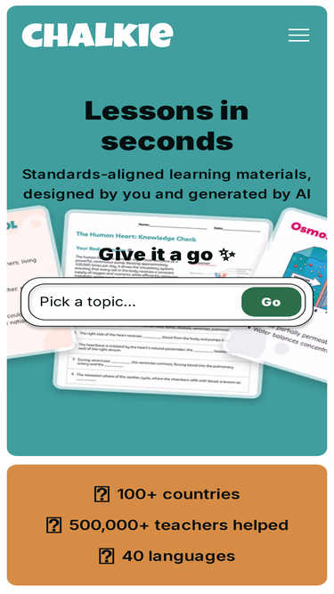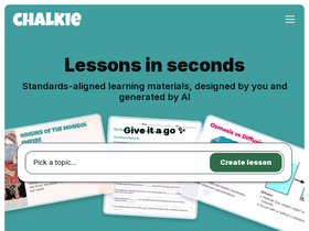 78%Chalkie is a tool for teachers to create classroom-ready lessons, sheets and activities faster than ever before. Create, edit and share lessons in seconds using AI.