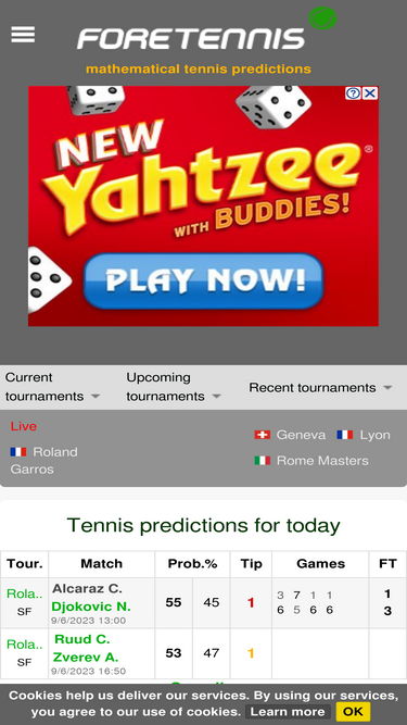 100%Mathematical tennis tips and predictions calculated by complex algorithms based on statistics. Fixtures, rankings, history, tennis tournaments.