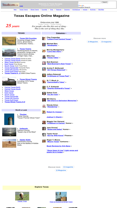 59%all things texas: cities, towns, counties, trips, attractions, people, syndicated columns, old/recent photos, vintage maps, hotels and much more.