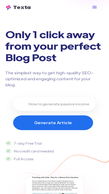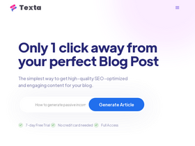 94%Texta.ai is an AI-powered tool that helps you write blog posts and generate article ideas effortlessly. Its intuitive design and advanced AI capabilities allow you to create high-quality content in minutes.