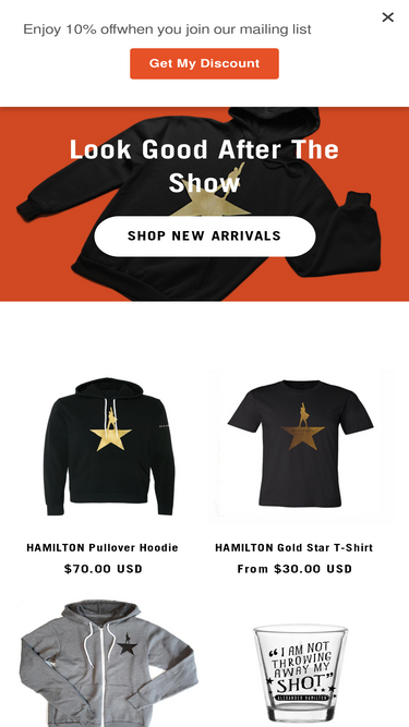 36%Official souvenir merchandise for Broadway shows and live entertainment, including Hamilton, Sweeney Todd, & Juliet, Funny Girl, and more!