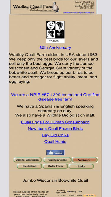 85%quail eggs at wadley quail farm in georgia. we strive for excellence and our bobwhite quail are some of the best. we keep only the best birds for our layers and sell only the best quail eggs. home of the georgia giant bobwhite quail. we are a npip tested and certified disease free farm