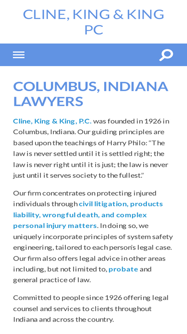 columbus, indiana lawyers cline, king & king, p.c. was founded in 1926 in columbus, indiana. our guiding principles are based upon the teachings of harry philo: “the law is never settled until it is settled right; the law is never right until it is just; the law is never just until it serves society to