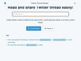 89%read twitter/x threads in a clean, distraction-free format. convert threads to pdf, images, or audio for easy sharing and offline reading. the best twitter thread reader and converter.