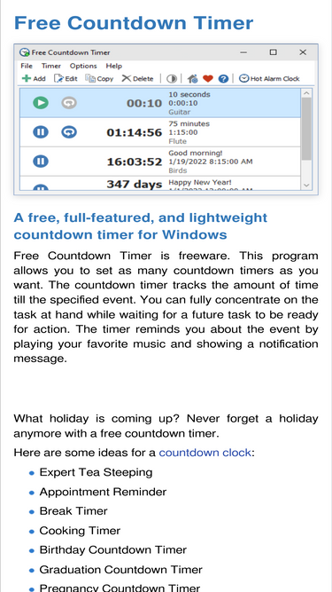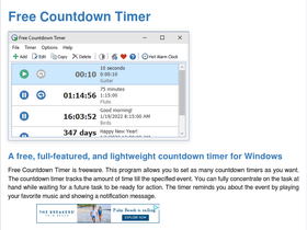 98%Free Countdown Timer is a free, full-featured, and user-friendly countdown timer for Windows. Free Countdown Timer is freeware. This program allows you to set as many countdown timers as you want.