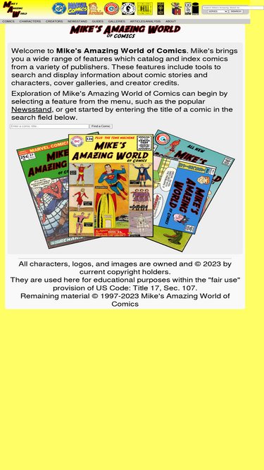 75%mike's amazing world of comics. a searchable resource indexing comics from multiple publishers, including dc, marvel, archie, charlton, dell, gold key and harvey. contains comic information and cover images for thousands of issues.