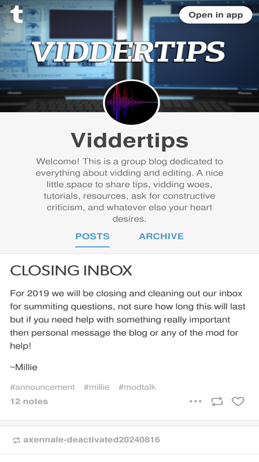 92%Welcome! This is a group blog dedicated to everything about vidding and editing. A nice little space to share tips, vidding woes, tutorials, resources, ask for constructive criticism, and whatever else your heart desires.