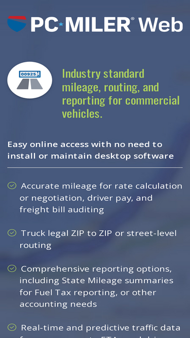 Get accurate mileage for rate calculation, driver pay and extensive route planning powered by PC*Miler