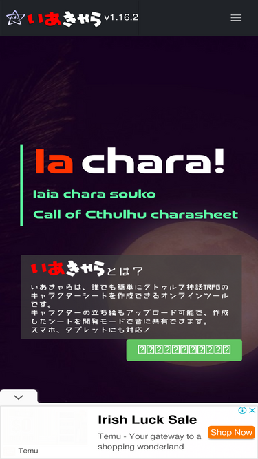 95%クトゥルフ神話TRPG用のWEBダイスツールです。通常のダイスツールのほか、クリックするだけで自動的にパラメータが計算される「キャラシート作成」機能も。アプリ・ソフトはインストール不要、ブラウザから使うWEBツールです。スマホからでも使えます!
