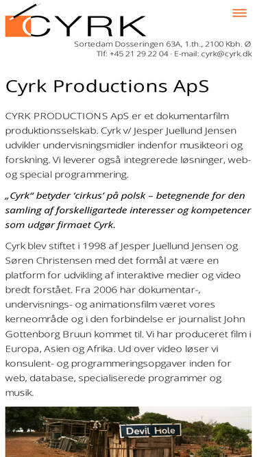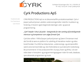 100%cyrk productions aps er et dokumentarfilm produktionsselskab. cyrk leverer også intregerede løsninger, web- og special programmering.