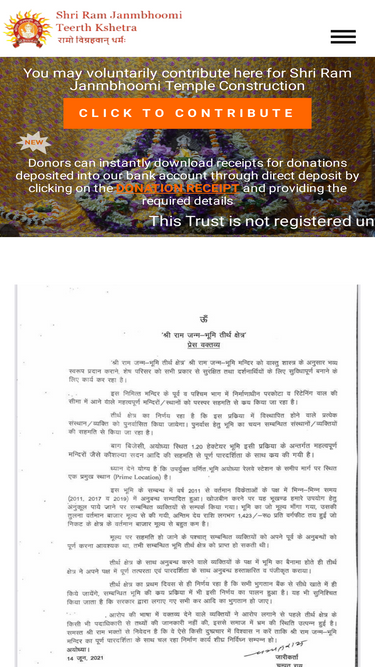 85%ऊँ—’श्री राम जन्म-भूमि तीर्थ क्षेत्र’ प्रेस वक्तव्य ‘श्री राम जन्म-भूमि तीर्थ क्षेत्र’ श्री राम जन्म-भूमि मन्दिर को वास्तु शास्त्र के अनुसार भव्य स्वरूप प्रदान कराने, शेष परिसर को सभी प्रकार से सुरक्षित तथा दर्शनार्थियों के लिए सुविधापूर्ण बनाने के लिए कार्य कर रहा है। इस निमित्त मन्दिर के पूर्व व पश्चिम भाग में निर्माणाधीन परकोटा […]
