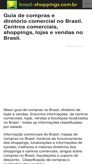 35%maior guia on-line de compras no brasil e diretório de lojas e vendas. encontrar informações dos centros comerciais, lojas e vendas localizadas no brasil - todas informações classificadas por estado. informação de compras no brasil: mapas de compras no brasil, horários de funcionamento dos shoppings, localizações e informações de contato, melhores e maiores diretórios dos shoppings e centros comerciais, artigos sobre compras no brasil, liquidações e cupons de desconto.