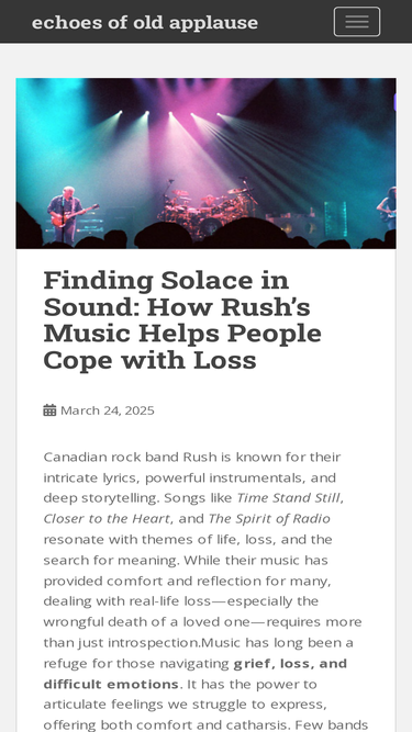 98%welcome to echoes of old applause. one of the most comprehensive rush fan sites on theworld wide web. jordan finkelstein aka jman2112. rush tour photos, test for echo,vapor trails, r30 anniversary tour, geddy lee, alex lifeson, neil peart.