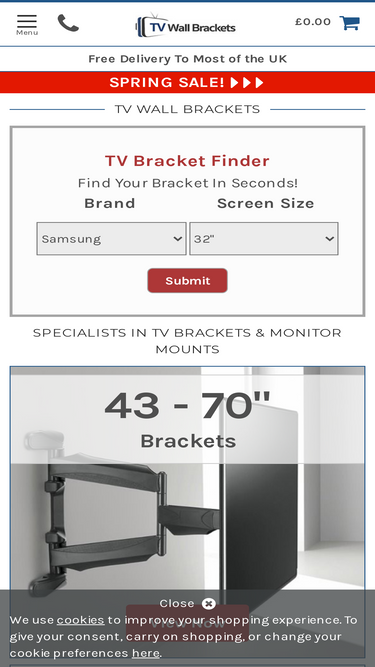 78%online specialist for tv wall brackets. on here you will find any tv wall bracket you want from 43" cantilever arm mounts to a 15" flat mount. free uk delivery on everything.