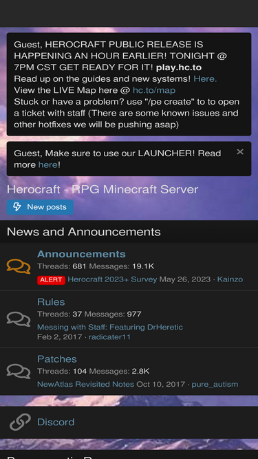 83%Discover the ultimate RPG Minecraft server at Herocraft. Immerse yourself in a one-of-a-kind experience that seamlessly blends Classes, Leveling Survival, and Roleplay. Join us to embark on an unforgettable journey filled with adventure, strategic gameplay, and endless possibilities. Unleash...
