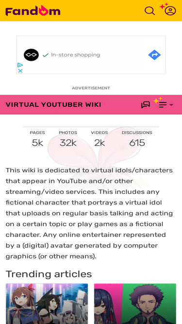 100%This wiki is dedicated to virtual idols/characters that appear in YouTube and/or other streaming/video services. This includes any fictional character that portrays a virtual idol that uploads on regular basis talking and acting on a certain topic or play games as a fictional character. Any online entertainer represented by a (digital) avatar generated by computer graphics (or other means).