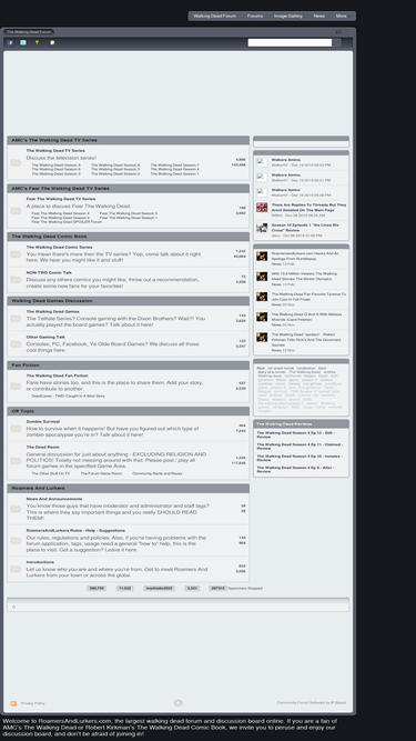 100%the walking dead forums and fansite at roamersandlurkers.com. if your a fan of the walking dead comic book and amcs the walking dead tv series, join our active forums for discussions, fan collaborations, and much more.