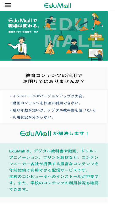 edumall(エデュモール)は、デジタル教科書や動画、ドリル・アニメーション、プリント教材など、コンテンツメーカー各社が提供する豊富なコンテンツを年間契約で利用できる教育用デジタルコンテンツ配信サービスです。