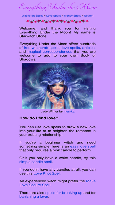 100%the best site for free wiccan love spells, money charms, witchcraft & wicca articles, tarot readings, forum and more. )o(