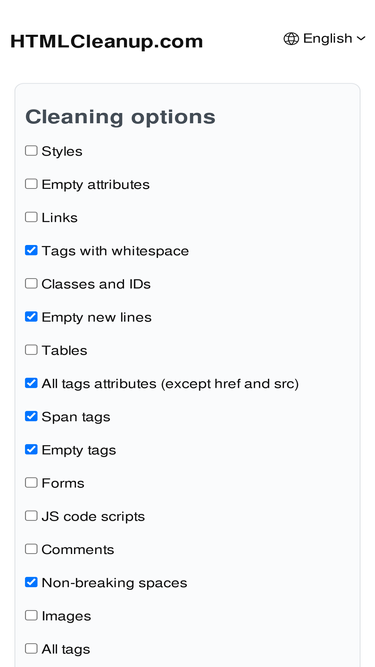 82%Clean HTML code effortlessly with HTMLCleanup.com. Remove unwanted styles, tags, or classes from your HTML. Customize your cleanup process for optimized and efficient web code.