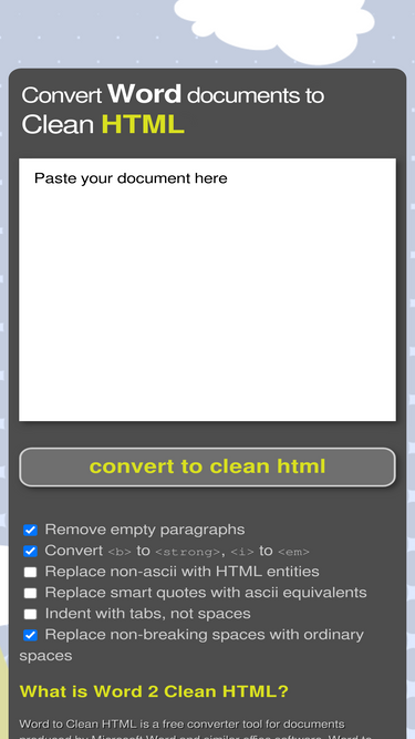 87%Convert your visual text documents to HTML code instantly. Edit and clean your markup with a couple of clicks.