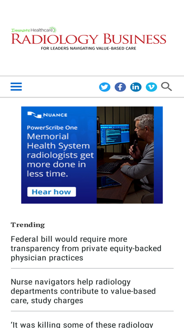 92%radiology business delivers news and content with a keen focus on fiscal, operational, managerial and other economic perspectives. our mission is to offer insight and guidance for hospitals, health systems and imaging centers to lead their teams, enhance care delivery and succeed in a value-based environment. our mission is to offer insight and guidance for hospitals, health systems and imaging centers to lead their teams, enhance care delivery and succeed in a value-based environment. this trusted, interactive community brings together radiology and medical imaging department, facility and health system decision-makers. we engage and unite chiefs of radiology, radiologists, radiology administrators, directors and managers, it specialists and healthcare executives. radiology business dives into the strategies and resources market leaders and innovators are using to improve the quality, accountability and interoperability of their care.