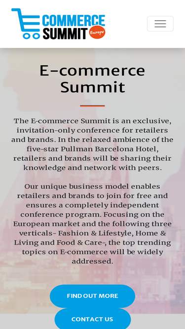 the e-commerce summit is an exclusive, invitation-only conference for retailers and brands. in the relaxed ambience of the five-star pullman barcelona hotel, retailers and brands will be sharing their knowledge and network with peers. our unique business model enables retailers and brands to join for free and ensures a completely independent conference program. focusing on the european market and the following three verticals- fashion & lifestyle, home & living and food & care-, the top trending topics on e-commerce will be widely addressed.