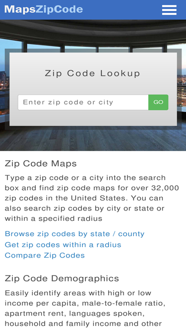 free zip code lookup with maps demographics. find us zip codes by city or county, or perform a zip code lookup.