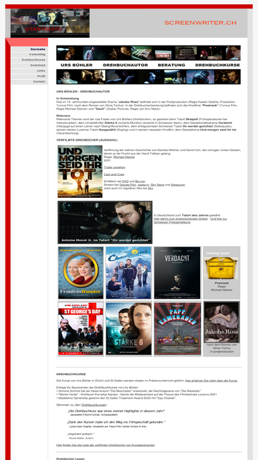 58%screenwriter.ch bietet drehbuchberatung, drehbuchkurse, links zum thema drehbuchschreiben und praktische downloads. hinter screenwriter.ch steht drehbuchautor & script-consultant urs bühler. er berät schweizer, deutsche und österreichische produktionsfirmen und entwickelt deutsch- und englischsprachige projekte. urs bühler hat die drehbücher verfasst von filmen wie